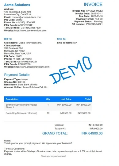 Create customized invoices for businesses, educational institutes, commercial use, and pathology labs.